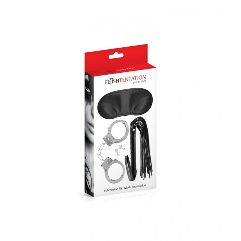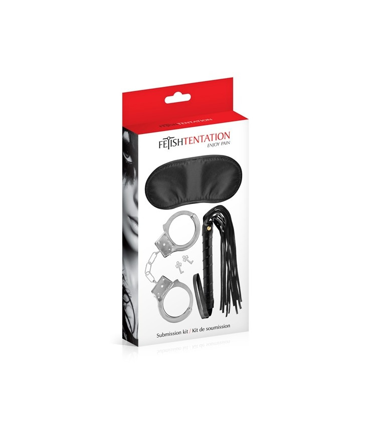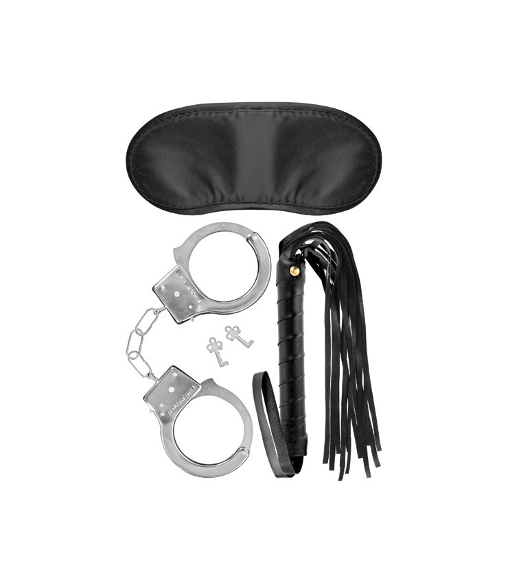 Kit para principiantes formado por: látigo, antifaz, esposas.