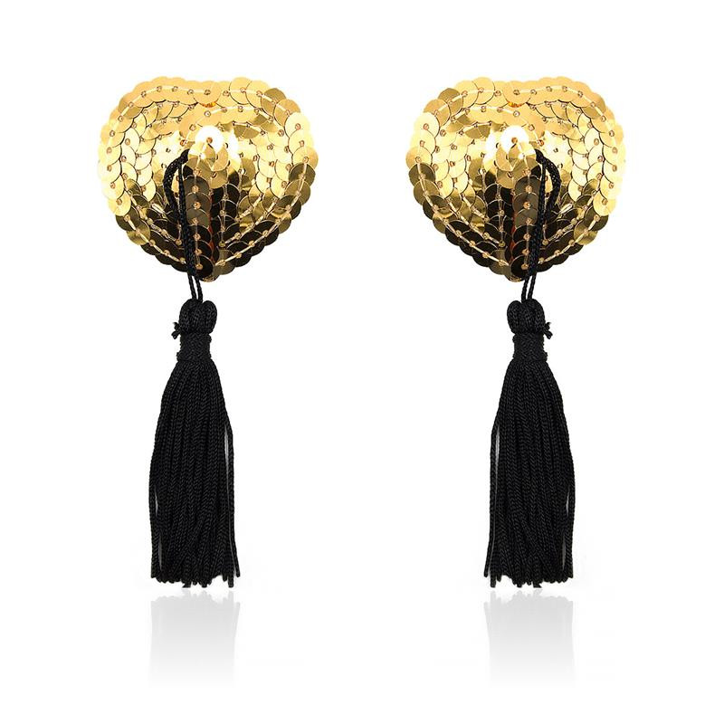 Unas pezoneras autoadhesivas en forma de corazón están recubiertas de lentejuelas doradas y cuenta con un largo pompón negro, ideal para completar cualquier look y sorprender a quien tengas delante.