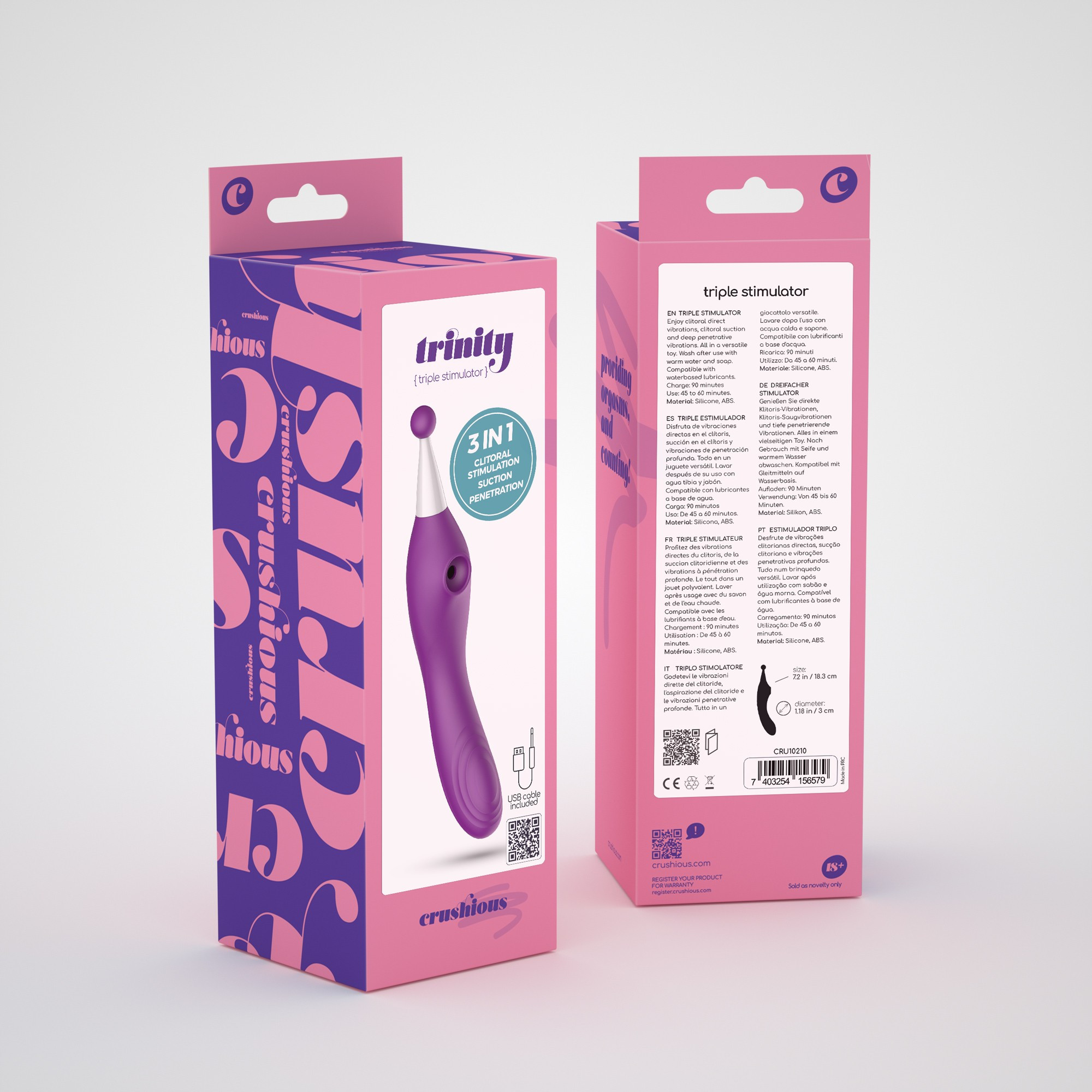 Trinity reúne lo mejor de lo mejor, y puede experimentar desde 3 modos de succión que proporcionan una intensa estimulación del clítoris sin contacto directo; y 10 velocidades de vibración en la punta perfectamente redondeada para esos momentos en los que su clítoris simplemente pide esa estimulación extra; en la punta opuesta encuentra un eje con 10 velocidades de vibración y la forma perfecta para mimar incluso el punto G más tímido.