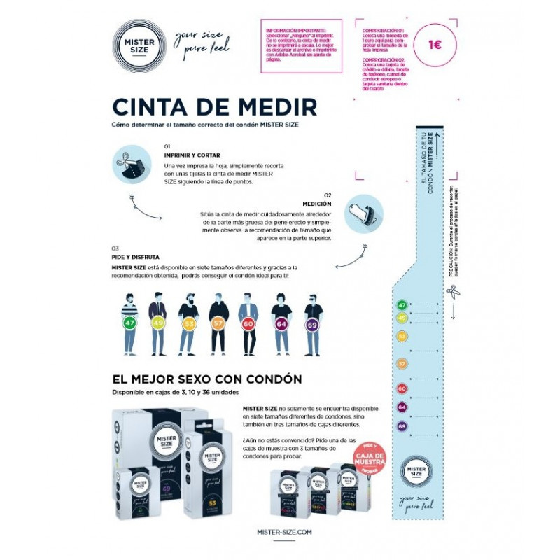 Mister Size cuenta con una gran gama de tallas especiales de anchura para el pene. Podrás encontrar 7 tallas de anchura del preservativo: 47 mm, 49 mm, 53 mm, 57 mm, 60 mm, 64 mm y 69 mm. Todos ellos extrafinos.