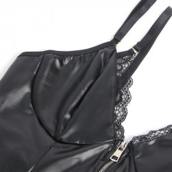 Atrévete a deslumbrar con este body negro de encaje y cuero PU, ideal para realzar tus curvas con sensualidad y poder.