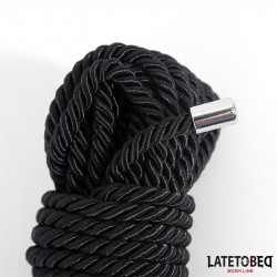 Cuerda de bondage negra de 10 metros, perfecta para juegos eróticos de restricción y dominación.