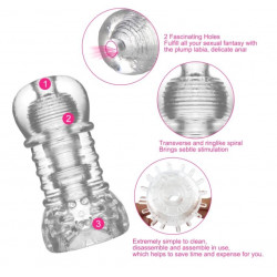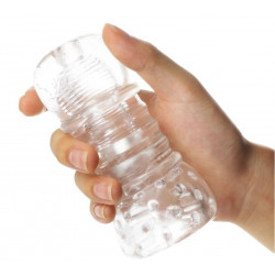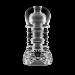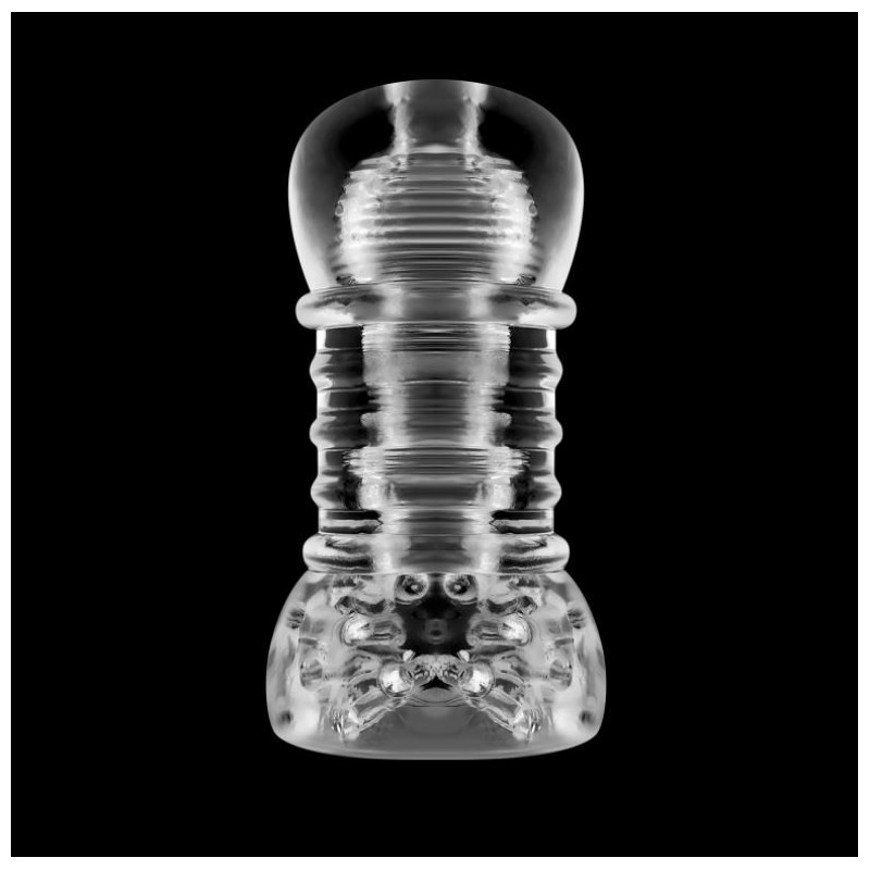 Masturbador masculino transparente con texturas internas intensas y diseño abierto que se adapta a todos los tamaños.
